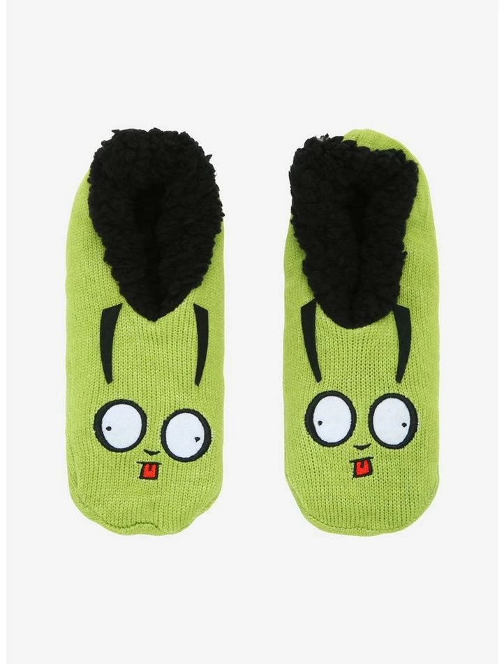 All those snacks put you in a food coma? Kick your feet up and relax with theseΒ Invader Zim cozy slippers! Featuring GIR’s dog face embroidered on the top, sherpa lining and non-slip grips.